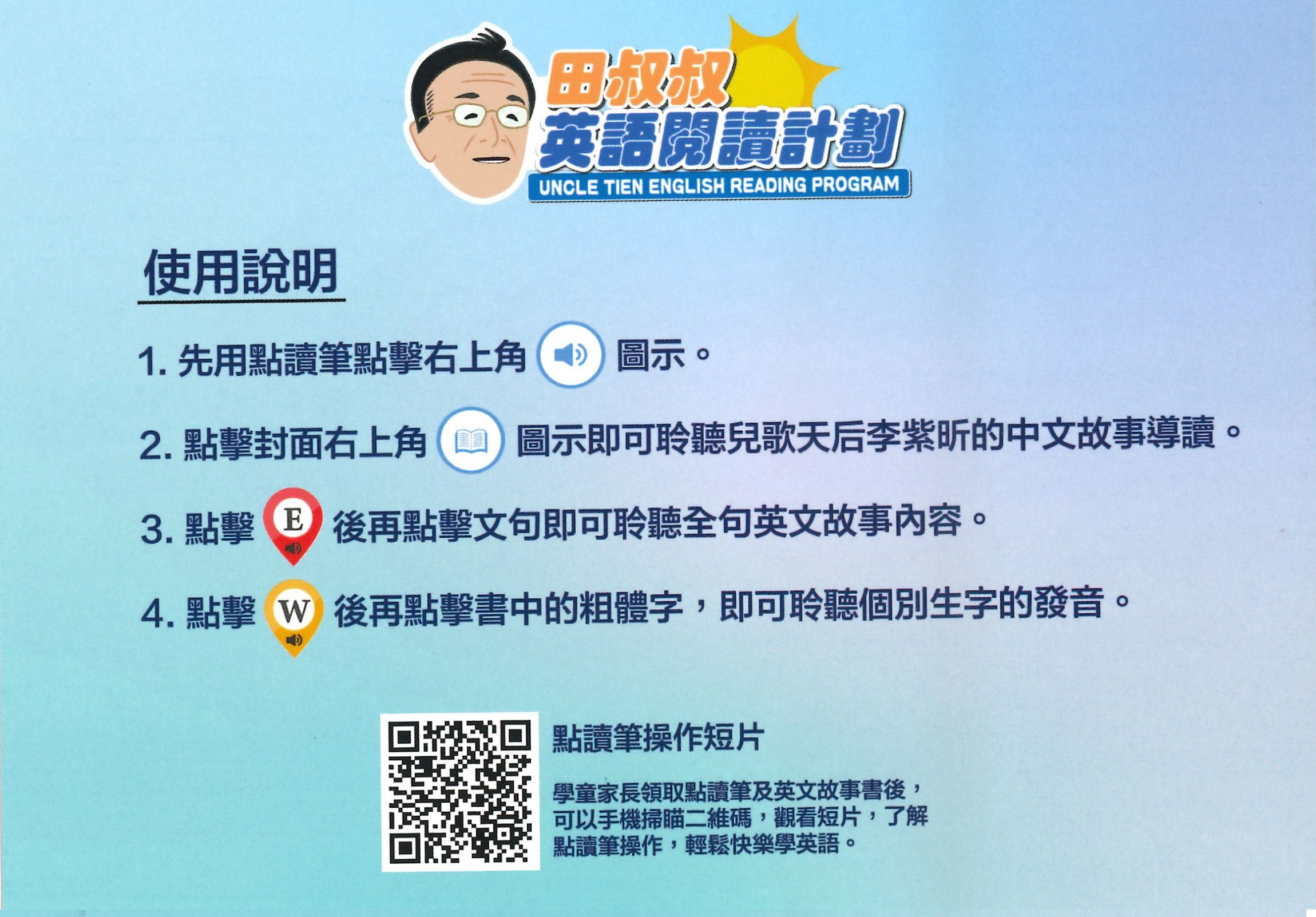 本校已參與「田叔叔英語閱讀計劃」,計劃希望向有志學好英語,並於2019年9月升讀全港任何本地幼稚園高班(K3)的*基層學童,免費贈送壹支電子點讀筆及每月派一套(4本)英文故事書,為期三年,直至小學二年級(P2)階段為止。